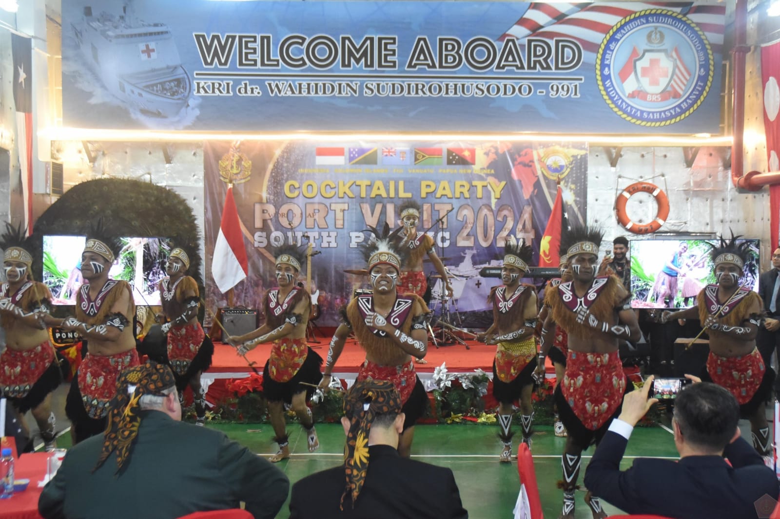 MERPOS, PAPUA, –Satgas Port Visit 2024 menggelar Cocktail Party di Hanggar Heli KRI WSH-991, Port Moresby, Papua New Guinea, pada Senin malam (18/11/2024). Acara ini dihadiri pejabat tinggi PNG dan delegasi asing, menampilkan tarian Nusantara serta jamuan menu khas Indonesia.